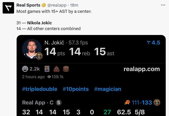 本场连续拿下三双后,又将生涯拿下15+助攻场次提升至31场,断层高居NBA历史中锋第一,而其他中锋一共仅在14场比赛中交出过15+助攻表现。